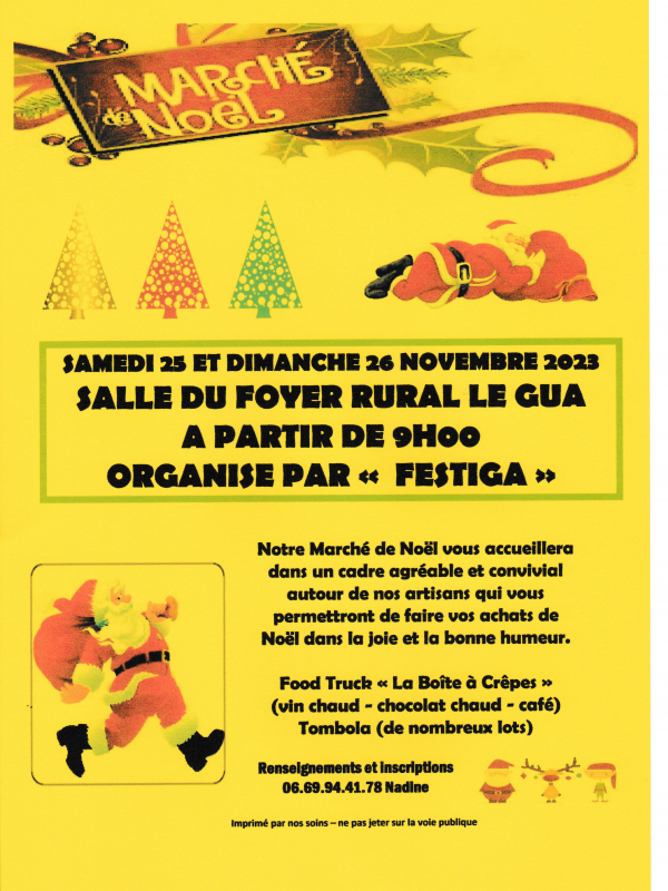 Marché de Noel Guitinières en fête " près de Jonzac" Entrée gratuite à la salle polyvalente avec producteurs, artisans, particuliers.Animation avec le père noël. Restauration sur place. Hot dog , frites, quiche, crêpes et vin chaudrenseignements:... Localisation : 17500 GUITINIÈRES