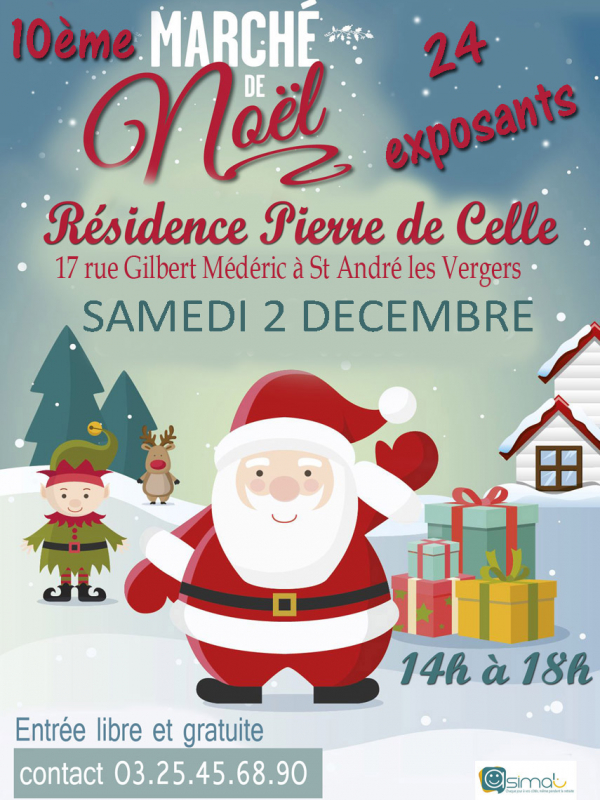 12ème marché de noël Marché de Noel organisé par l'équipe de l'EHPAD Pierre à St André les Vergers. 24 exposants vous attendent à l'intérieur avec vin chaud, crêpes et bonne humeur, le profit des ventes hors... Localisation : 10120 ST ANDRÉ LES VERGERS