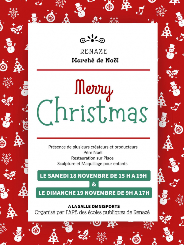 marché de noël organisé par l'APE de renazé le samedi 18 novembre de 15h à 19h et le dimanche 19 novembre de 9h à 17h, salle omnisport de renazé. possibilité de se restaurer sur place. Tombola gratuite , maquillage enfants , sculpture de ballons , présence du père noël.