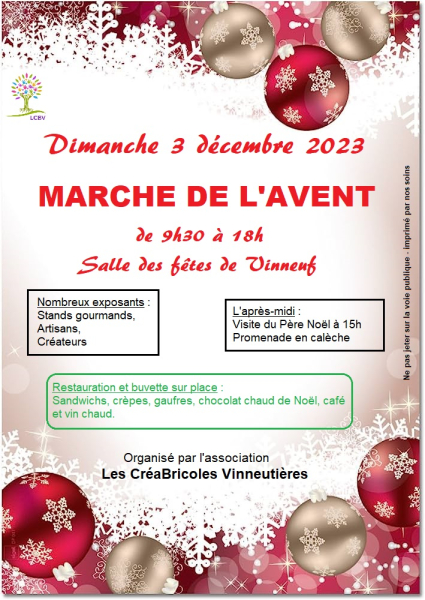 L'association les créabricoles vinneutières organise son premier marché de l'Avent à vinneuf (89) le dimanche 3 décembre 2023 à partir de 9h30 jusqu'à 18h.