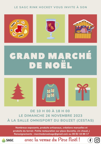Marché de noel 2025 SAGC RINK HOCKEY Cestas Ouverture exposants à partir de 8hLes stands seront limités à 2 mètres linéaires, dans la limite de deux stands par exposant (soit 4 mètres linéaires au maximum).Ils sont équipés par défaut... Localisation : 33610 CESTAS
