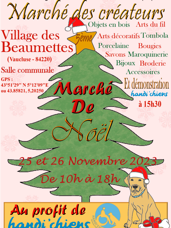 L'Atelier des Cigales organise la cinquième édition du «Marché de Noël de Créateurs" au Village des Beaumettes (Vaucluse) en collaboration avec la Mairie des Beaumettes. Cet événement est organisé au profit et avec la présence de Handi'Chiens.