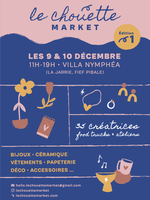 Le Chouette Market réunit 35 créatrices (une première édition 100% féminine) de La Rochelle, son agglomération et plus largement la Côte Ouest aux savoir-faire artisanaux et artistiques uniques et authentiques le temps d'un week-end.