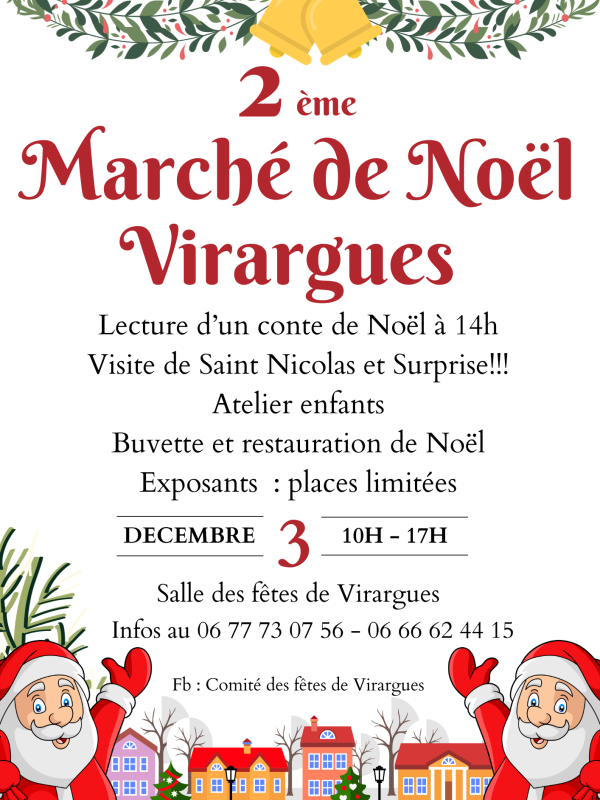 Pour son deuxième Marché de Noel à Virargues, nous vous accueillons dimanche 3 décembre 2023 de 10h à 17h à la salle des fêtes de Virargues le bourg.