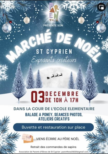 Marché de noël organisé par l’association des parents d’élèves « l’association parenthèse » de saint Cyprien. Le dimanche 3 décembre 2023 de 10h à 17h dans la cour de l’école élémentaire.