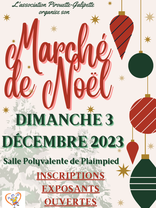 Cette année encore l'association Pirouette Galipette organise le marché de Noël qui se tiendra dimanche 3 décembre à la salle polyvalente de Plaimpied. Venez nombreux à partir de 10h pour découvrir les différents stands de nos artisan(e)s partenaires et participer à notre grande tombola. De nombreux lots sont à gagner et une buvette vous permettra de partager un moment convivial.