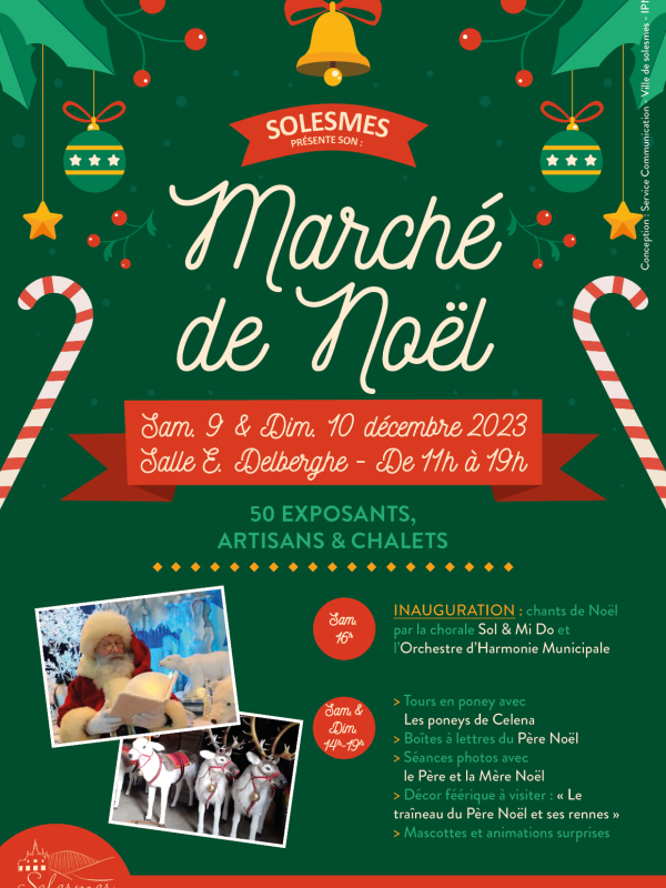 Venez flâner au Marché de Noël de Solesmes (59730), salle Edouard Delberghe (49 rue du Ponceau), les 9 et 10 décembre 2023 de 11h à 19h. Les festivités démarreront le 9 décembre avec l'inauguration du marché par les chants de la chorale locale accompagnée de l'Orchestre d'Harmonie Municipale.