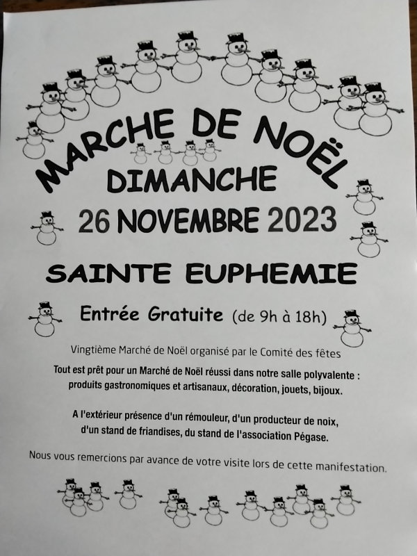 Le comité des fêtes de Sainte-Euphémie vous attend nombreux à la salle des fêtes du village pour son 20éme marché de Noël réservé aux produits artisanaux vendus par leurs fabricants