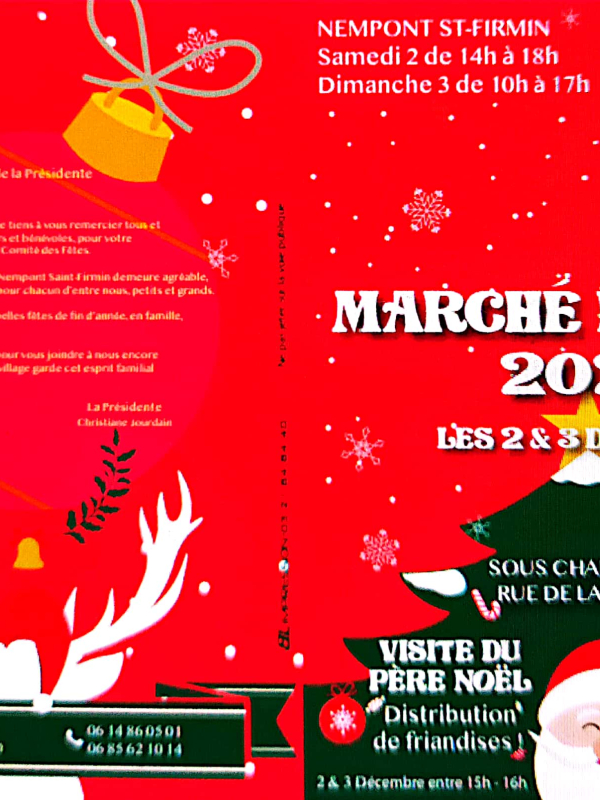 Notre comité des fêtes organise un marché de Noël le week-end des 2 & 3 décembre 2023, dans le centre bourg de la commune de NEMPONT SAINT FIRMIN 62180. Le samedi de 14h à 18h et le dimanche de 10h à 17h. Il y aura une quinzaine d'exposants sous chapiteau, dans la cour de l'école.