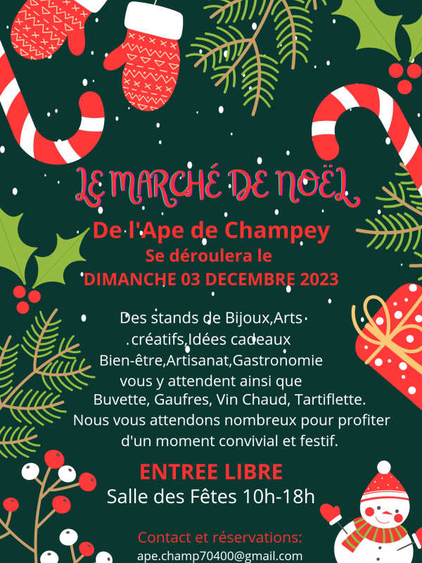 L'Association des Parents d'Élèves organise sa 9ème édition du marche de Noël de Champey, qui aura lieu le Dimanche 3 Décembre 2023 de 10h à 18h.