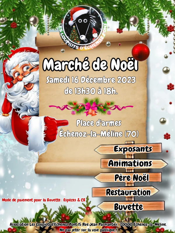 MARCHE DE NOEL 13/12/2025 ECHENOZ LA MELINE Marché de Noel d’Echenoz la Méline Samedi 13 Décembre 2025De 13h30 à 17h30ExposantsPère NoelJeux gratuit enfants + (Maquillage 1€ ,Choisi ton cadeaux 0,50cts & 1€) Défilé des pères... Localisation : 70000 ECHENOZ LA MÉLINE