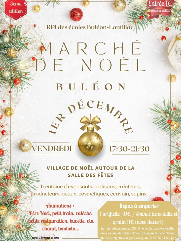 Le RPI des écoles de Buléon et Lantillac organise son 3ème marché de Noël nocturne autour et dans la salle des fêtes, le vendredi 1er décembre de 17h30 à 21h30.