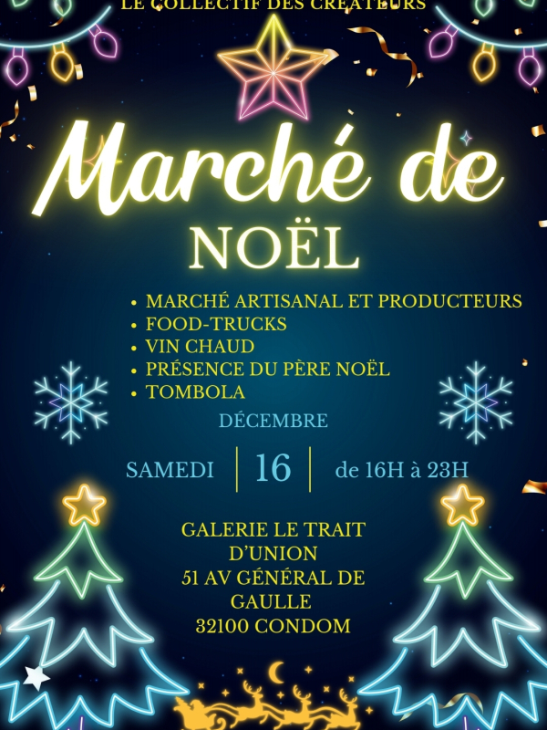 Venez nombreux a notre marché de Noël créateurs producteurs vente de vin chaud chocolat chaud présence du père Noël et une tombola a la galerie Le Trait d'Union 51 avenue Général de Gaulle 32100 condom