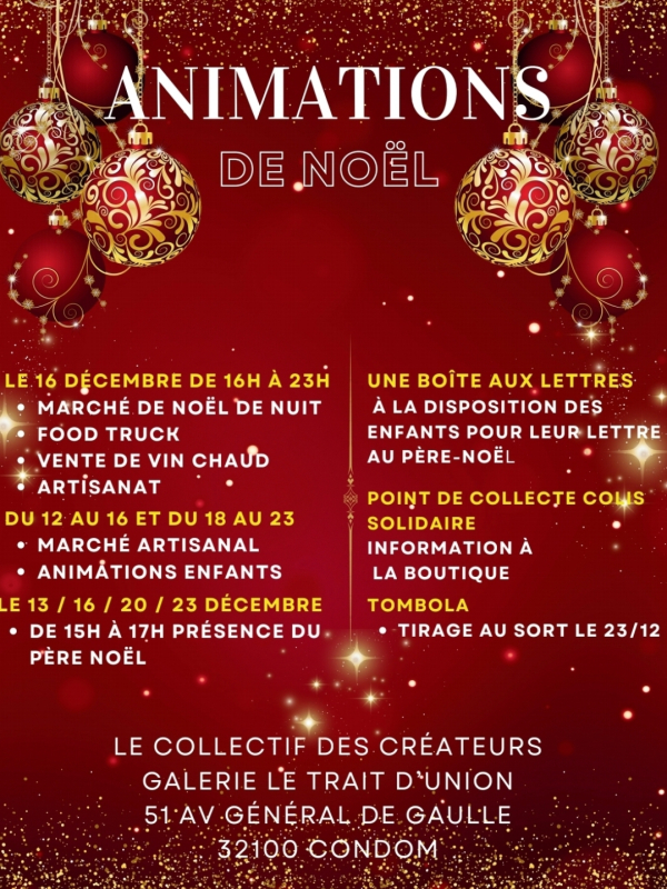 Venez nombreux a notre marché de Noël créateurs producteurs vente de vin chaud chocolat chaud présence du père Noël et une tombola a la galerie Le Trait d'Union 51 avenue Général de Gaulle 32100 condom