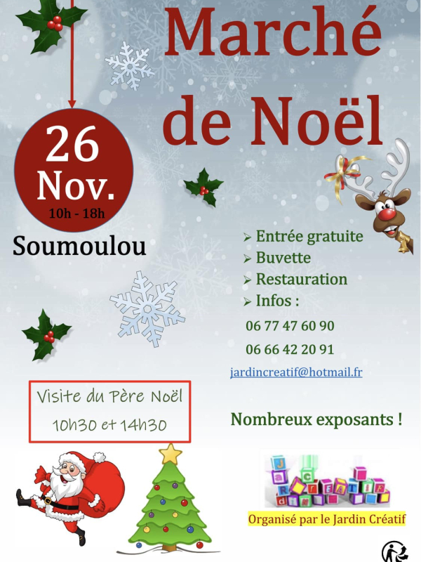 Vous êtes ici : Liste des marchés de Noël > Calendrier des marchés de Noël > MARCHE DE NOEL A SOUMOULOU