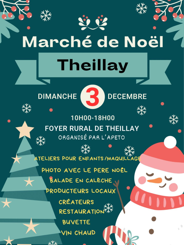 2ème édition de notre marché de noël organisée par l’APETO association des parents d’élèves de theillay, orçay. De nombreuses animations vous attendent: marché de noël en musique avec de nombreux artisans et producteurs locaux, photos avec le père noël, boîte aux lettres de noël, atelier pour enfants, maquillage, tour en calèche…