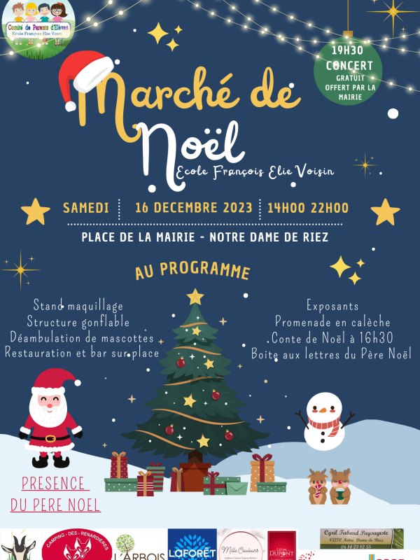 Le Marché de Noël se déroule sur le parking de la Mairie de Notre Dame de Riez de 14h à 22h.