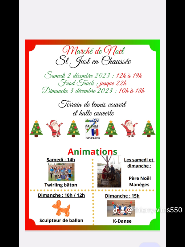 Venez nombreux voir les 60 exposants et de l animations tout le week-end. Vous pourrez prendre une photo avec le père noël et aussi à partir de 14h00 suivre l' association TWIRLING BÂTON qui défilera de la gare de Saint Just en Chaussée jusqu'au marché de Noël. Le groupe K DANCE effectuera sa prestation sur scène le dimanche.