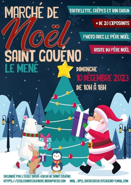 Marché de Noël de Saint-Gouéno L'association des parents d'élèves de l'école Sacré Cœur organisent son traditionnel marché de noël le dimanche 7 décembre 2025 à la salle des fêtes de Saint-Gouéno.Cette année, vous... Localisation : 22 330 SAINT-GOUÉNO