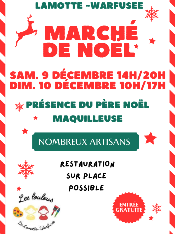Marché de Noël organisé par l'association des Loulous de Lamotte warfusee, nombreux artisans, des idées de cadeaux, bière, chocolat, confitures, boudin....
