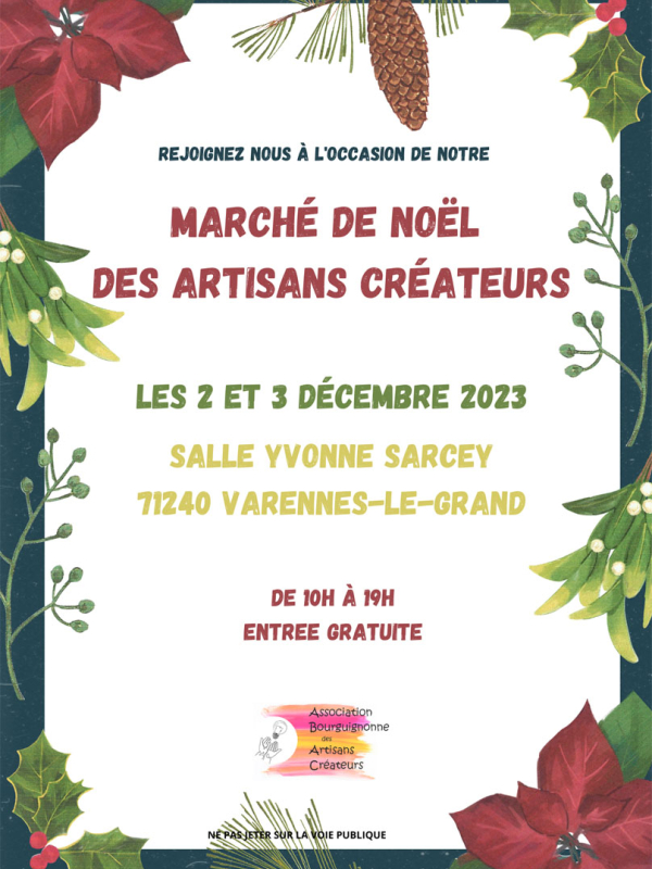 C’est à la Salle des Fêtes Yvonne Sarcey les 02 et 03 Décembre 2023 que vous pourrez admirer des Artisans lors de notre second Marché de Noël ( gravure sur verre ; bijoux-déco argile polymère et résine ; travail du fer et coutellerie ; compositions florales ; maroquinerie ; textile soie en relief ; bijoux macramé et pierre naturelles ; savons et cosmétiques fait main ; textile enfants ; photos argentique ; artiste ongulaire ; bijoux en graines végétales ; vitrail ; tableaux en galets ; sculpture terre et argile ; bois et époxy ; bijoux litho thérapie ; décor sur porcelaine et céramique). Une tombola sera organisée sur les deux jours !