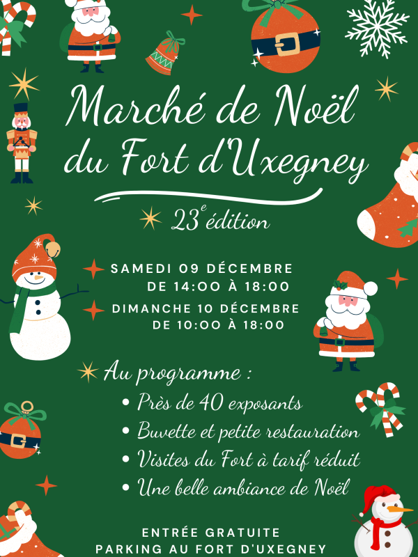 Enfin vous découvrirez le Fort d’Uxegney dans une ambiance de Noël avec de nombreuses décorations mises en place par les bénévoles, si vous souhaitez en découvrir plus sur cet ouvrage construit de 1882 à 1884, des visites réduites seront possibles !Rendez-vous donc le samedi 9 décembre de 14h à 18h et le dimanche 10 décembre de 10h à 18h au Fort d’Uxegney.