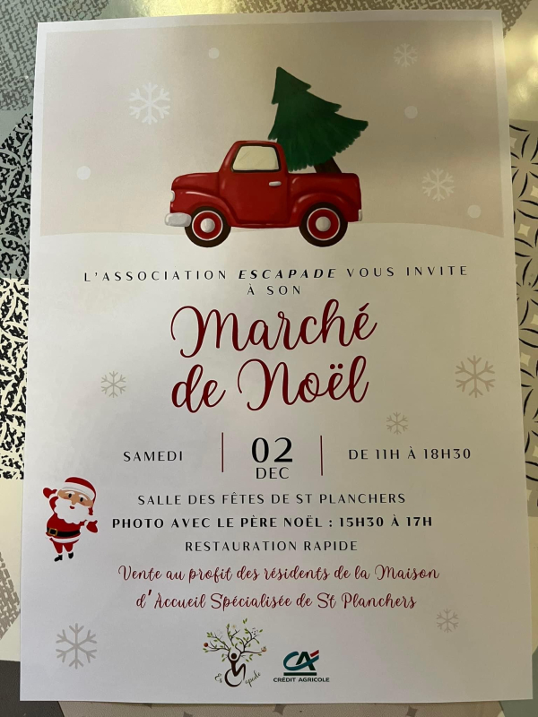Le marché de Noël de l association "Escapade" est prêt pour demain. 11h à 18h30 salle des fêtes de Saint Planchers. Restauration rapide sur place : croque monsieur, crêpes salés et sucrées....