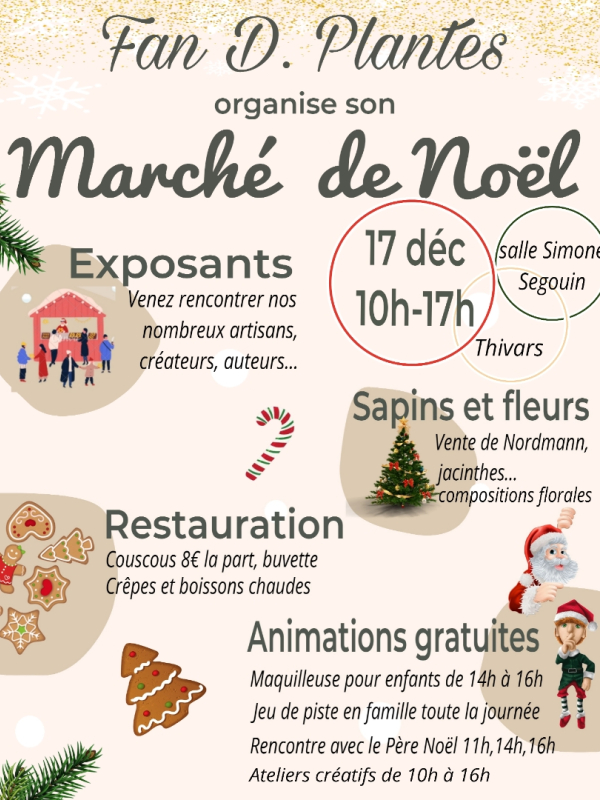 Comme tous les ans Fan D. Plantes organise son marché de Noël. cette année-la manifestation se déroulera à la salle des fêtes de Thivars (espace Simone Segouin) place de mairie.