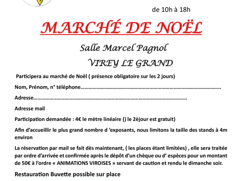 marché de noël 2025 Marché de Noël de Virey le grand Recherchons exposants tous métiers /bouches:/artisanats /le marché se fais en salle acceptons les exposants avec leurs structures pour exposer à l'extérieur /... Localisation : 71530 VIREY LE GRAND