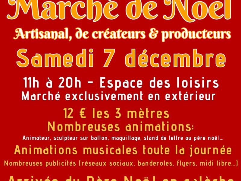 Les inscriptions pour la 4ᵉ édition du marché de Noël sont ouvertes ! Cette année, des nouveautés vous attendent : le marché aura lieu un samedi, avec des horaires étendus de 11h à 20h, et se déroulera partiellement de nuit. L’arrivée féerique du père Noël en calèche est prévue en soirée. Éclairé et décoré avec soin par les bénévoles, le marché promet une ambiance magique. Les exposants sont invités à soigner leur décoration, avec un point d'électricité disponible sur demande.