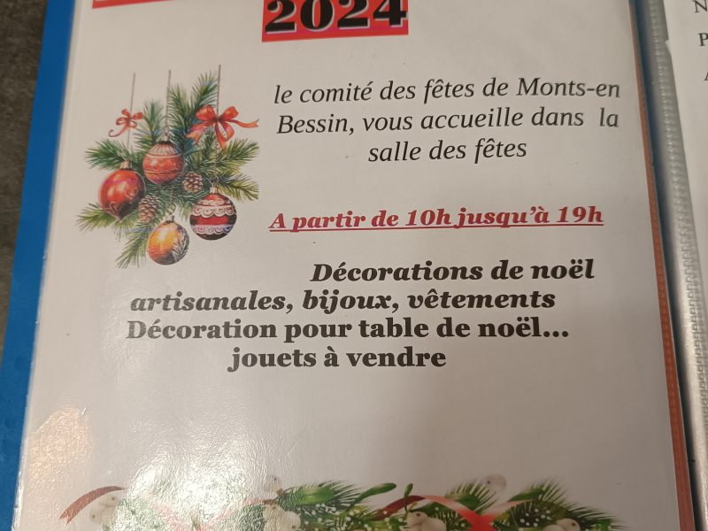 Marché de Noël à monts en Bessin dans la salle polyvalente, table à disposition avec chaises,6€ le mètres restauration sur place, plus de renseignements contactez le 0680604948