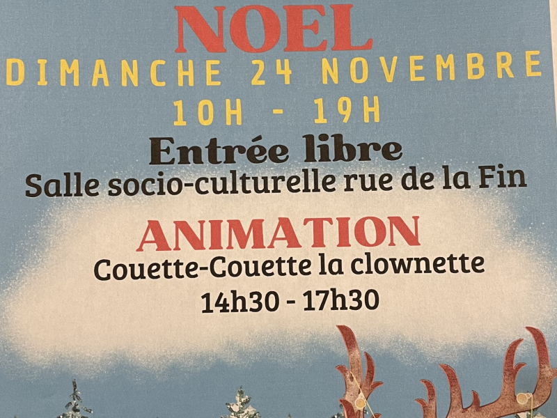 Marché de Noël dans la salle socioculturelle avec environ 40 exposants. Animation l’après-midi : Couette Couette La Clownette- restauration- - buvette - tombola