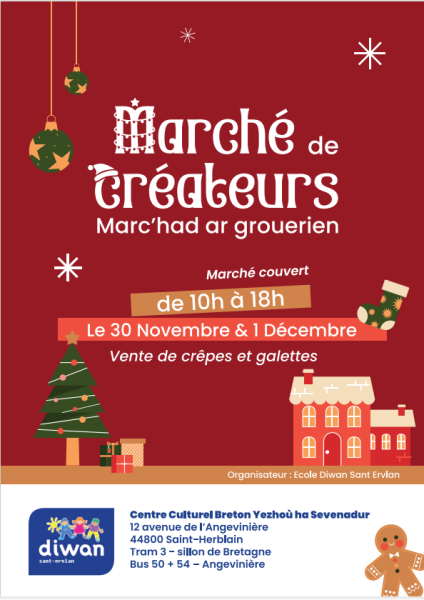 Vous êtes ici : Liste des marchés de Noël > Calendrier des marchés de Noël > Marché de créateurs Diwan Saint Herblain