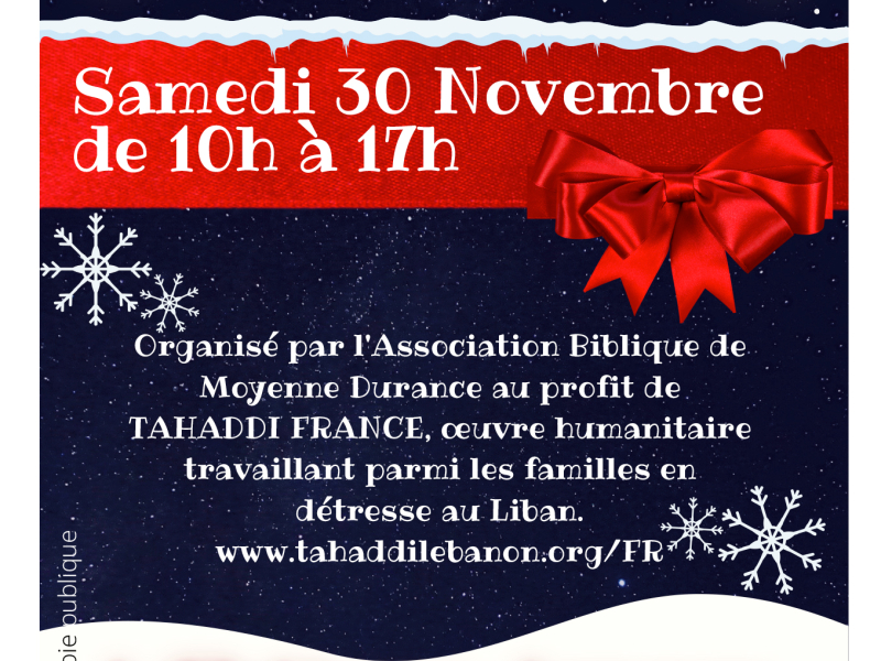 L'Association Biblique de Moyenne Durance organise son 11ème Marché de Noël sur la place du Commerce à Château-Arnoux (04). Tous les articles sont faits main, fabriqués par les membres et amis de l'association. Vous y trouverez beaucoup d'idées de cadeaux de fin d’année : bijoux, articles en bois, jouets, décorations de Noël, bougies, gâteaux, confitures, vin chaud, gaufres... Les bénéfices du marché soutiennent « Tahaddi France », œuvre humanitaire travaillant parmi les familles en détresse au Liban. Tous les très bienvenus.