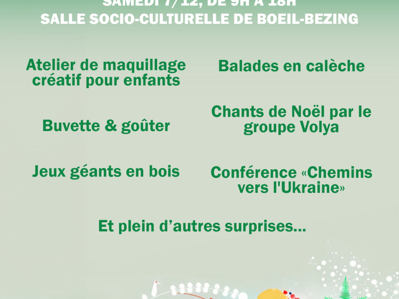 Association franco ukrainienne VESNA64 propose un marché unique de l'artisanat ukrainien avec participation de nos partenaires français. Les points forts seront les animations typiques du folklore slave: chants de Noël en ukrainien par le groupe Volya, ateliers de créativité pour enfants, goûter original avec les pâtisseries d'ailleurs, conférence " Chemins vers l'Ukraine " sur le travail d'aide humanitaire en Béarn, maquillage pour enfants, jeux géants en bois, ballades en calèche sur les traces de l'histoire à Boeil Bezing et d'autres surprises.