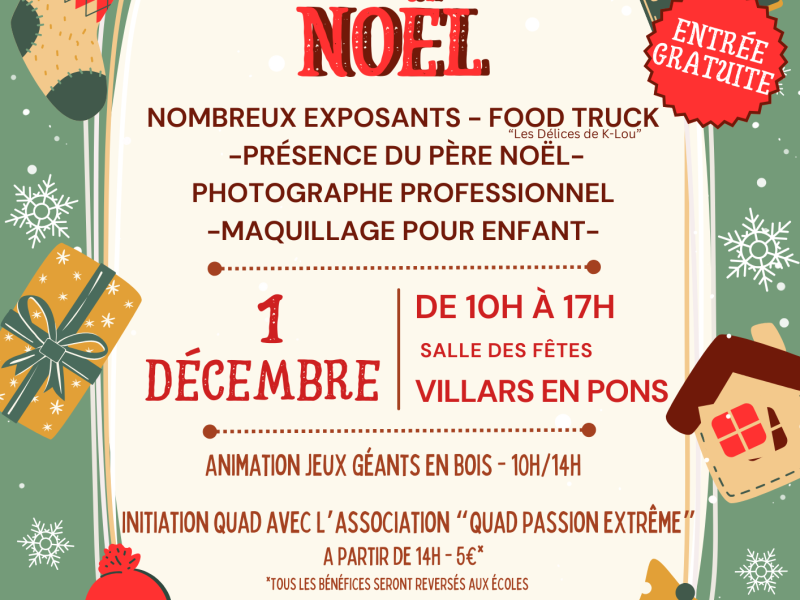 * Nombreux exposants* Maxi Tombola* Présence du Père Noël et séance photo avec un photographe professionnel Tempaw Photographie (impression immédiate)* Atelier lettre au Père Noël* Maquillage pour les enfants* Animation jeux géants en bois avec Julie de Oika Oika (10h-14h)* Initiation au quad avec Association quad passion extrême (à partir de 14h)* Buvette et petite restauration sucrée des P'tits Drôles* Restauration salée avec le Food Truck les Les Délices De K'Lou Venez passer une belle journée en notre compagnie, on vous attend nombreux.
