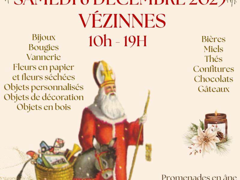 Marche de Noël - Marché de la St Nicolas Marché de la St Nicolas à Vézinnes (89700)Nombreux exposants, alimentation salée et sucrée, miels, bières, vins, gâteaux et confiseries, chocolats, décoration, objets en bois, objets... Localisation : 89700 VÉZINNES