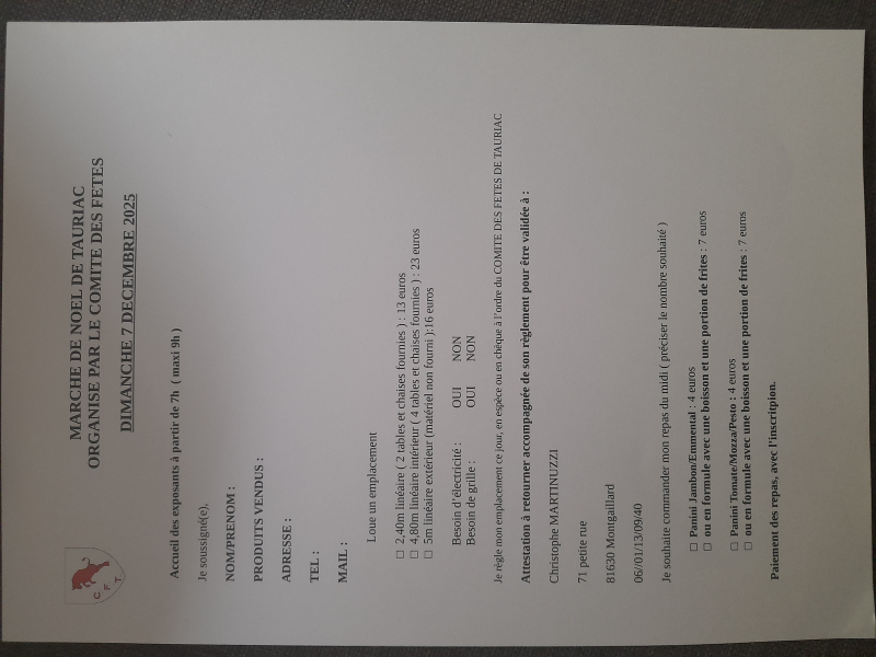 Marche de noel a tauriac 81 organise par le comite des fêtes du village le dimanche 7 décembre de 9h a 18h .Caleche, père noel,atelier enfants..restauration rapide sur place. Accueil des exposants à partir de 7h. Emplacement intérieur/extérieur.voir bulletin d inscription.