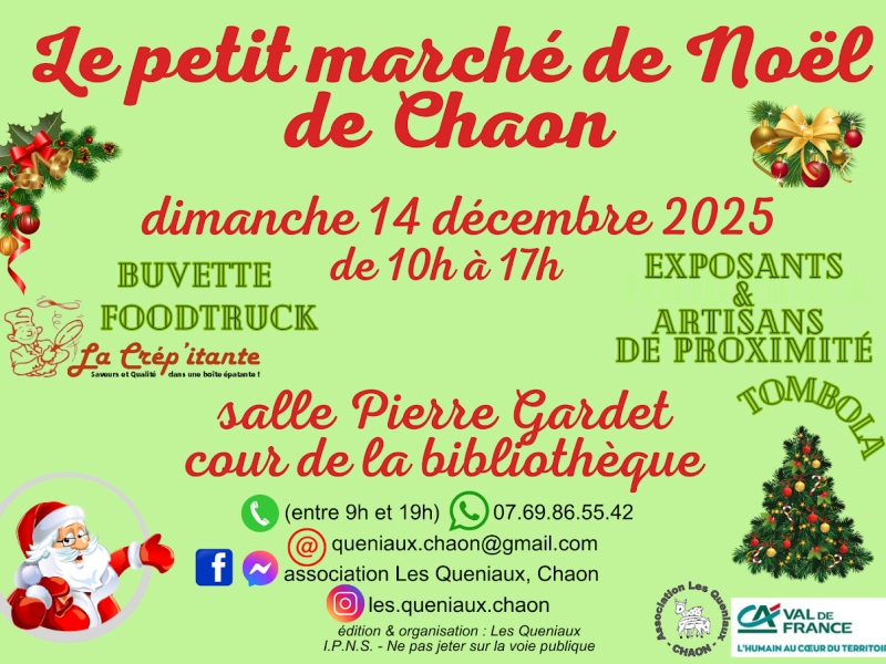 le petit marché de Noël de Chaon Les exposants variés, sans doublon, de qualité et locaux/régionauxDe quoi agréablement préparer les fêtes de fin d'année et passer un bon momentLe Père Noël est invité vers 11h et vers... Localisation : 41600 CHAON