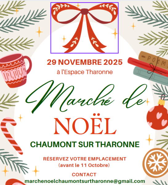 Le marché de Noël de Chaumont sur Tharonne est proposé par un collectif d'associations. Nous sommes heureux de vous inviter pour sa nouvelle édition. Il se tiendra à l'Espace Tharonne le 29 novembre 2025. Lecture de contes à 10:00 - atelier origami à 14:00 - tombola - vin chaud - crêpes des collégiens - restauration (truffade) sur place - buvette.