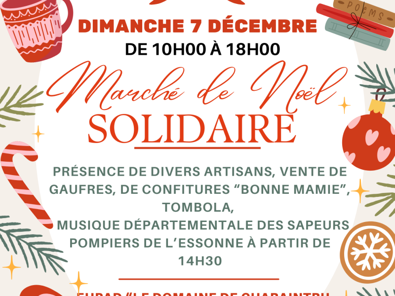 Marché de Noël solidaire mis en place par l'association Anim'actions Charaintru. Présence d'artisans, vente de gaufres, de confitures artisanales "Bonne mamie"confectionnées par des personnes âgées, tombola. Musique départementale des sapeurs pompiers de l'Essonne à partir de 14H30