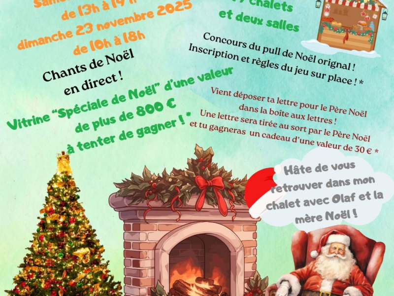 + de 70 exposants une vingtaine de chalets et 2 salles un décor féerique des chants de Noël en live, un sculpteur de ballon, maquillage, père noël et mère Noël tout le weekend, concours de pull de Noël, une vitrine de+ de 800€ à gagner et bien d autres surprises