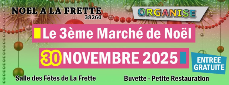 L'association Noël à La Frette organise son 3ème marché de Noël. L'entrée et le parking sont gratuits. Vous y trouverez des artisans qui vous proposerons des produits locaux pour vos cadeaux de Noël, de l'alimentaire et de la décoration. Venez nombreuses et nombreux. Vous trouverez également une buvette et une petite restauration.