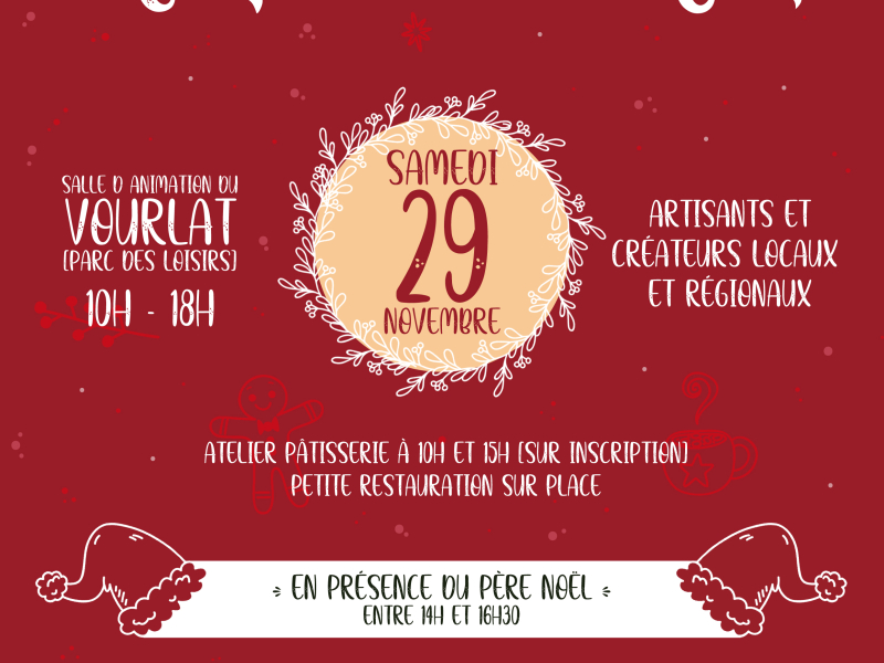 4ème édition du Marché de Noël avec les Artisans et créateurs du territoire : Bougies, Tissus, Bois, Décorations de noël, Cosmétiques, Bières, Céramiques, Papeteries, Gourmandises, Chocolat, Bijoux... Visite du Père Noël, Ateliers de pâtisserie pour les enfants, Buvette et restauration sur place. Comme chaque année, nous vous attendons nombreux, c'est Noël !
