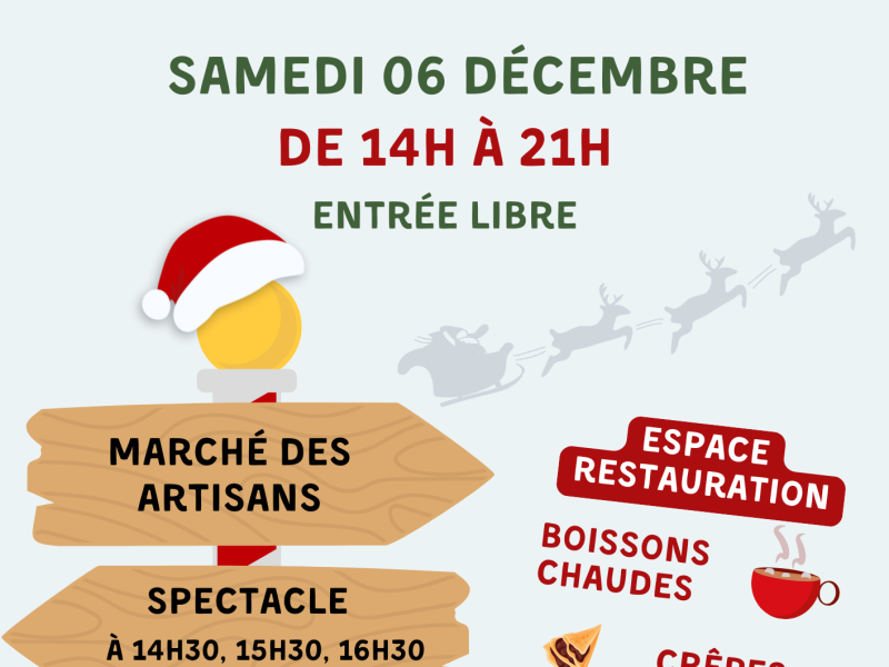Au programme : marché des artisans, spectacle, présence du Père-Noël, concours de pulls moches, espace restauration (boissons chaudes et crêpes) et vente de repas à emporter.