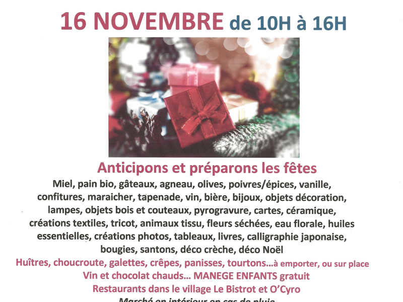 Miel, pain bio, gâteaux, agneau, olives, poivres/épices, vanille, , maraicher, tapenade, vin, bière, bijoux, objets décoration, lampes, objets bois et couteaux, pyrogravure, cartes, céramique, créations textiles, tricot, animaux tissu, fleurs séchées, eau florale, huiles essentielles, créations photos, tableaux, livres, calligraphie japonaise, bougies, santons, déco crèche, déco Noël