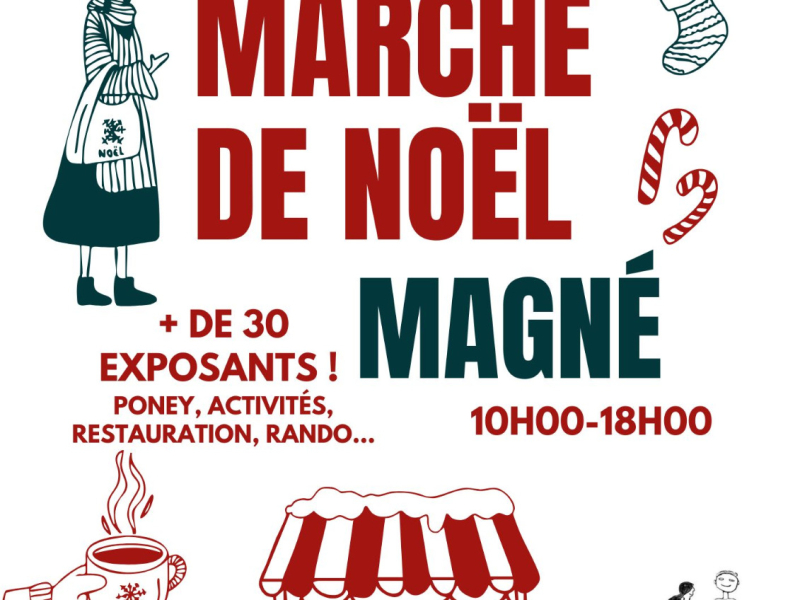 L'Association des Parents d'Elèves de Magné (86) renouvelle l'organisation de son marché de Noël sur la place du village. Comme chaque année nous proposons des animations pour les enfants : maquillage, balade en poney de l'élevage de la Fontenille (cette année encore), pêche à la ligne, arrivée du Père Noël, atelier créations de Noël.