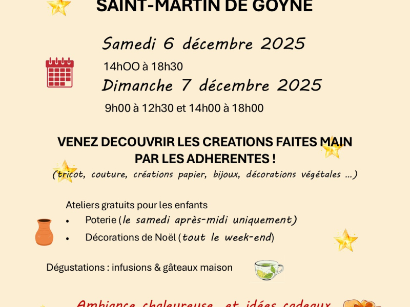 L’association LIVRES&PARTAGE organise la cinquième édition de son marché de Noël artisanal le samedi 6 décembre 2025 (de 14h00 à 18h30) et le dimanche 7 décembre 2025 (de 9h00 à 12h30 et de 14h00 à 18 h00) à la salle des fêtes de SAINT-MARTIN DE GOYNE.