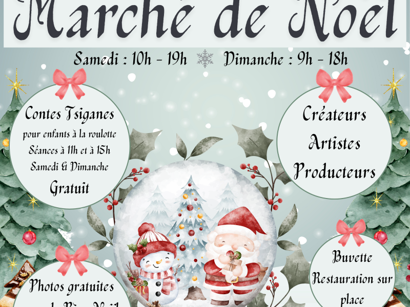 Marché de noël en intérieur avec une vingtaine de créateurs & producteurs : bijoux, miel, bois, décoration, fleurs, bougies, coutures maison & habillement, sacs, objets personnalisables ..... Contes tsiganes à la roulotte pour les enfants, gratuits. Photos avec le père noël devant un décor (gratuit, par vous même). Buvette & restauration sur place.