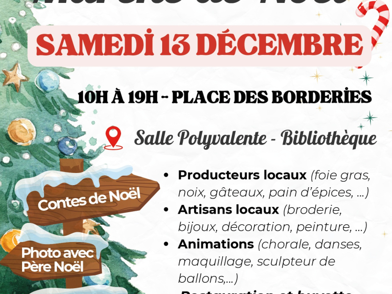 Marché de Noël Artisanal et Gourmand 2025 Marché de noël en intérieur avec une vingtaine de créateurs & producteurs : bijoux, miel, bois, décoration, fleurs, bougies, coutures maison & habillement, sacs, objets personnalisables ........ Localisation : 16720 SAINT MEME LES CARRIERES